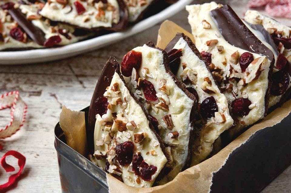 With its delicious white and dark chocolate layers, festive red cranberries, and crunchy pecans, this holiday candy is irresistible — and easy. For cookies & cream and peppermint versions, see "tips from our bakers," below.